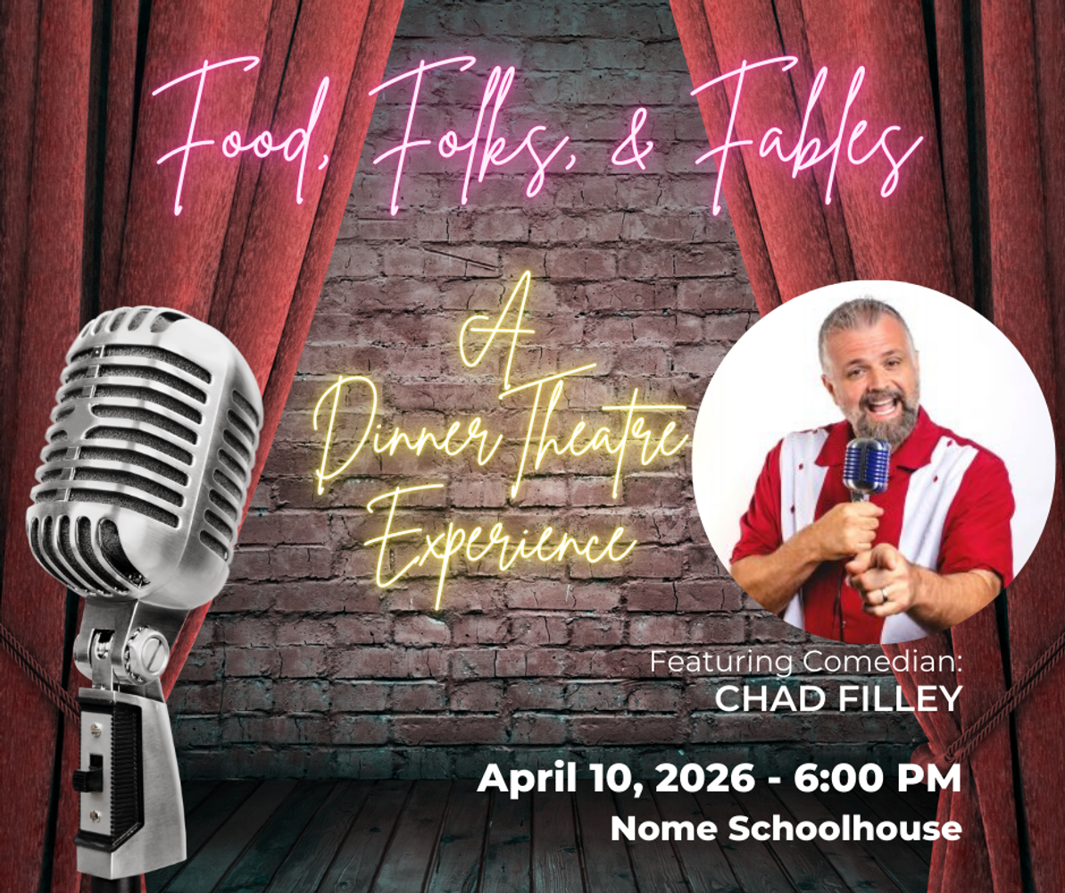 Join us at the historic Nome Schoolhouse for a premier Dinner Theatre event featuring the renowned humorist and historian, Chad Filley.